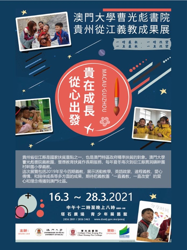 由澳门大学曹光彪书院主办、教育及青年发展局赞助的“‘贵’在成长、‘从’心出发—贵州从江义教成果展”,将于2021年3月16至28日于教育及青年发展局辖下的青少年展艺馆举行。欢迎有兴趣市民参观。