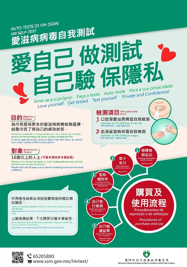 为推动爱滋病病毒检测,向公众提供多元的检测选择,鼓励市民了解自己的感染状态,卫生局已于3月9日推出了“爱滋病病毒自我检测先导计划”。市民只要完成简单和便捷的网上登记、电子支付及智能柜取件程序,在家中便可以自己收集样本、操作检测并解读结果。全程无须露面,进一步保障受检者隐私。