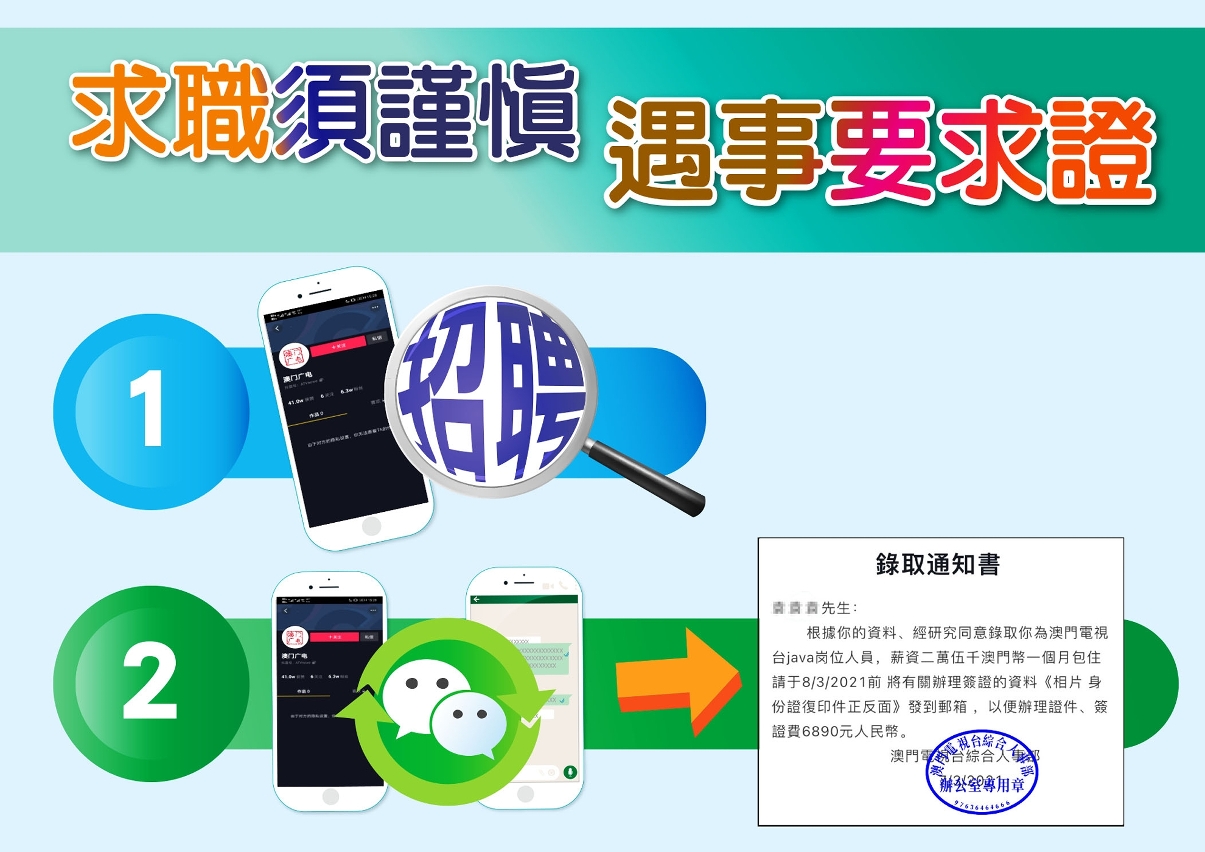 本局接获澳门广播电视股份有限公司(以下简称为澳广视)举报,指近日有内地居民致电查询该公司在内地进行招聘事宜;该名内地居民表示早前曾应聘“澳门电视台”某个职位,及后收到自称“澳门电视台”职员发送的盖上“澳门电视台综合人事部办公室专用章”的录取通知书,并着其提交办理签证的个人资料,以及需缴交六千多元人民币签证费用,故致电澳广视核实求证此事。