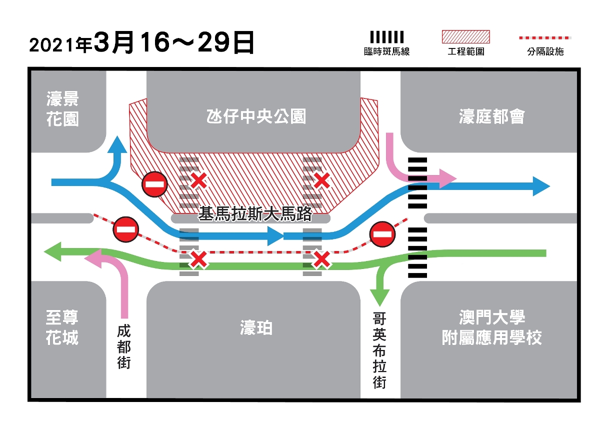 配合基马拉斯空中走廊工程,于3月16日至4月12日将重铺氹仔成都街与哥英布拉街之间的一段基马拉斯大马路。受工程影响,位于中央公园与濠珀之间的两条斑马路会临时停用,行人可使用近哥英布拉街路口的临时斑马线横过马路;3月16日至29日期间,近中央公园一侧的路段实施封闭交通,近濠珀一侧的路段则实施临时双向行车;巴士方面,此阶段相关巴士路线维持停靠现时设于近美景花园及近华宝花园的临时站。