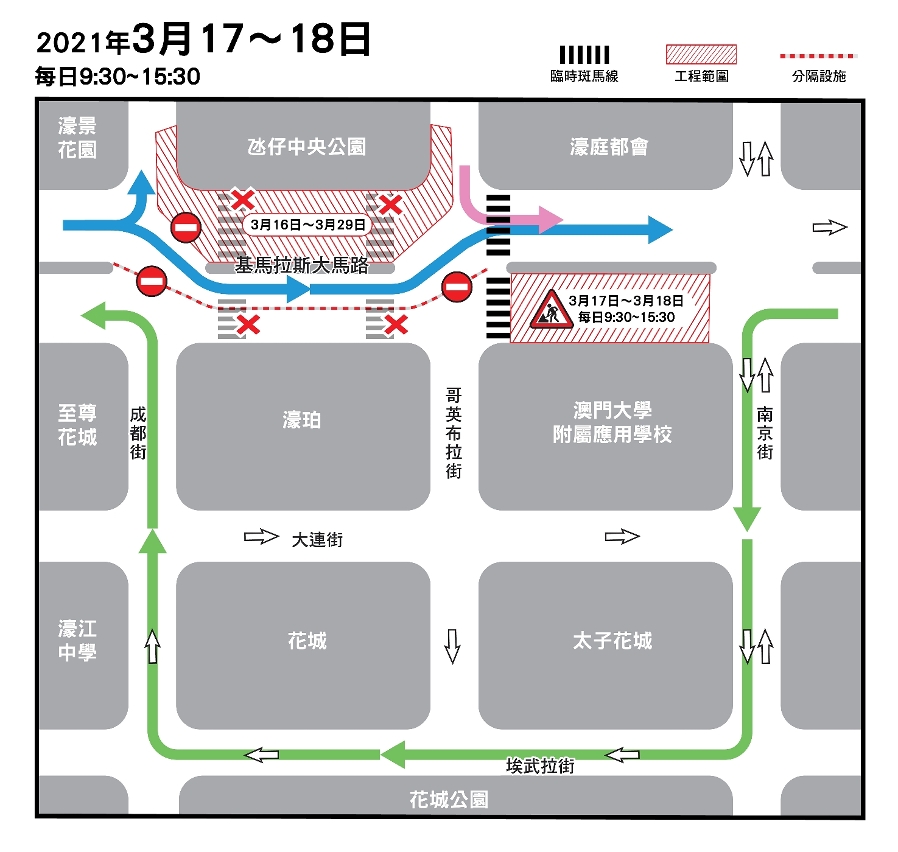 另外,配合于3月17日及18日每日上午9时30分至下午3时30分开展的行人天桥吊装工作,哥英布拉街与南京街之间、往运动场圆形地方向的一段基马拉斯大马路亦实施封闭交通,并禁止8米以上车辆驶入往运动场圆形地方向的一段基马拉斯大马路。
