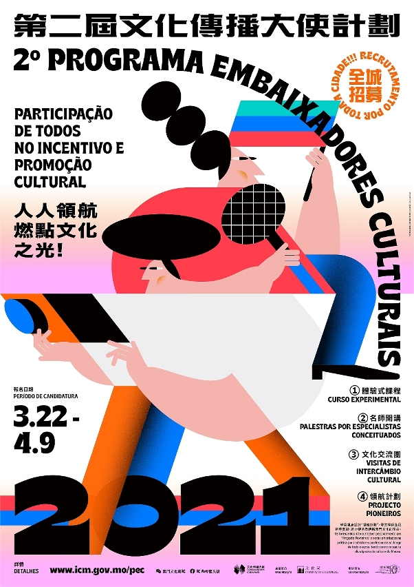 “文化传播大使”计划现正招募18岁或以上的澳门居民,且热爱文化艺术、对文化传播与传承充满热忱者参与,费用全免,文化局将根据报名表格之内容进行评估分析,并透过面试甄选,择优录取。市民可由即日起至4月9日,周一至周四9:00–13:00,14:30–17:45,周五9:00–13:00,14:30–17:30,将填妥的报名表格,连同个人履历及近照,递交至澳门塔石广场文化局大楼,或以电邮方式发送至zdcmacau@gmail.com,查询可于办公时间致电6666 0863(戴小姐) / 6697 2121(梁小姐)。“国家典礼仪式中的文化创意思考”讲座即日起至4月16日透过文化局网页“网上活动系统” (www.icm.gov.mo/eform/event)进行网上报名,倘报名人数多于指定名额时,将以电脑抽签形式决定,中签人士将于4月20日收到短信和专人通知,查询可于办公时间致电8399 6464 / 8399 6468。