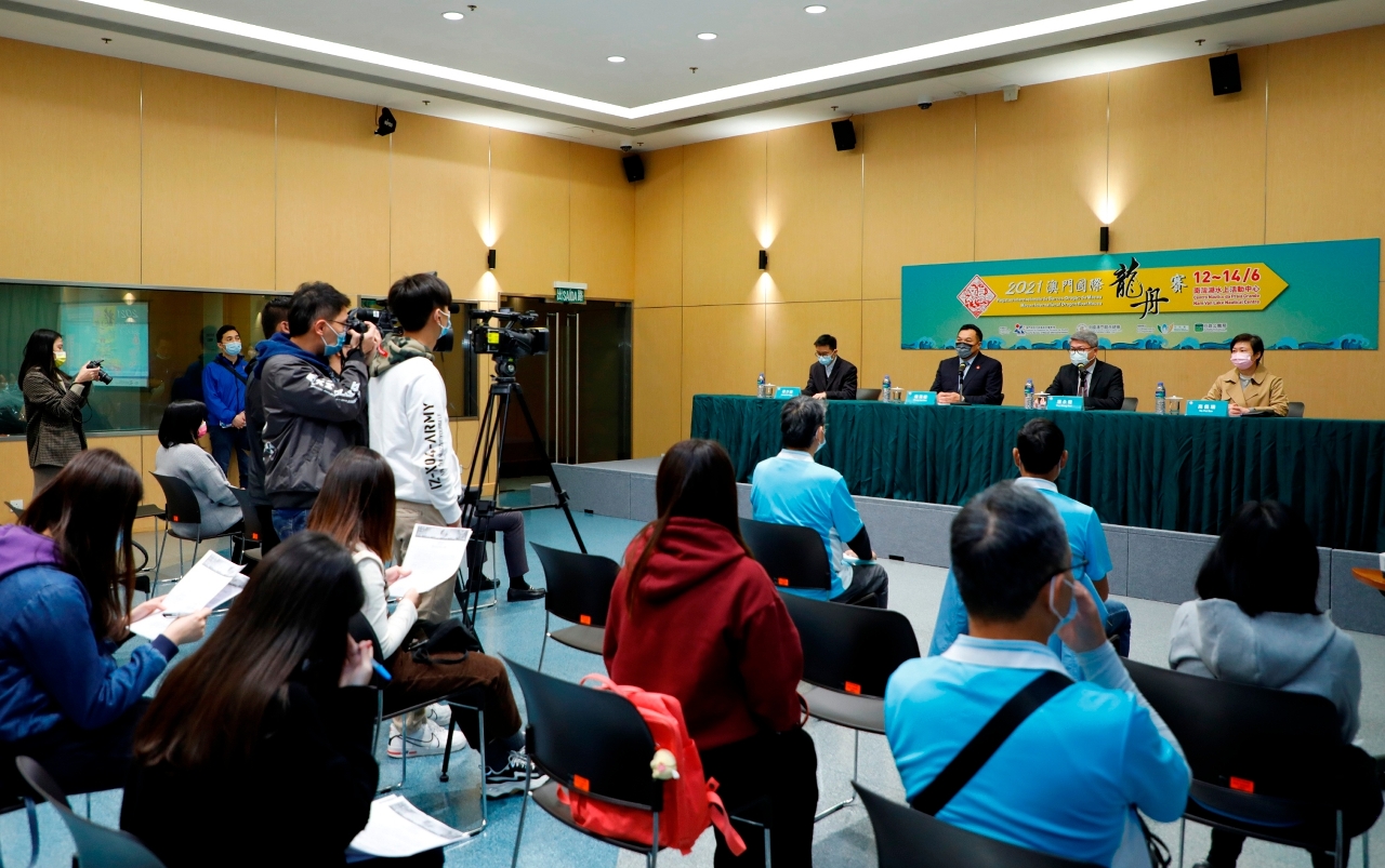 由体育局及中国澳门龙舟总会主办,市政署及行政公职局协办的“2021澳门国际龙舟赛”活动,将于本年6月12日至14日一连三天在南湾湖水上活动中心举行。赛事组委会今日(23日)举行新闻发布会,介绍活动详情。出席新闻发布会的嘉宾包括体育局局长潘永权、中国澳门龙舟总会理事长钟汉权、市政署文康及公民教育厅厅长高佩珊、行政公职局公职福利处处长梁少峰、体育局副局长刘楚远及林莲娇。