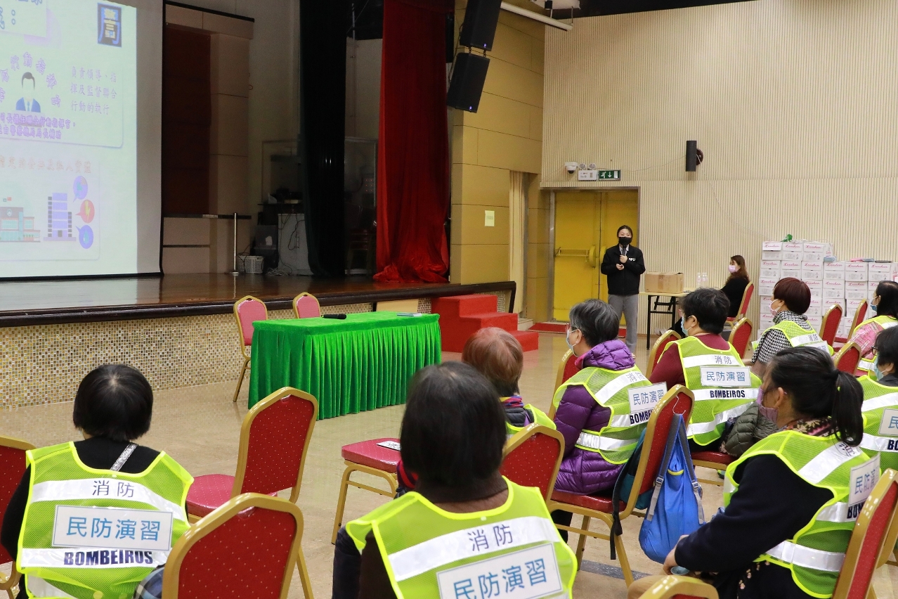 为进一步加强市民的防灾减灾意识及自救互助能力,确保于台风及风暴潮来临时能按照当局指示,迅速、安全有序撤离。于3月22日下午,在警察总局统筹下,消防局联同社会工作局在民众建澳联盟会址举行“台风期间风暴潮低洼地区疏散撤离计划”讲座,及后更进行疏散撤离演习,藉此提升市民防灾避险能力,同时深化本局与各部门的沟通协作机制,是次讲座和演习共有51名市民参与。
