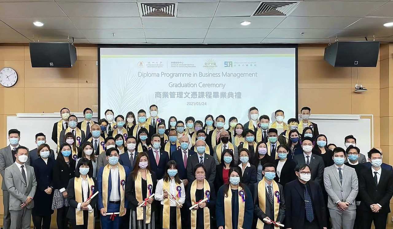 澳门大学持续进修中心与金沙中国有限公司为金沙团队合办的一年制商业管理文凭课程圆满结束并举行结业礼,向第五届(2018-2019年)及第六届(2019-2020)完成课程的46位学员颁发文凭证书并作出嘉许。
