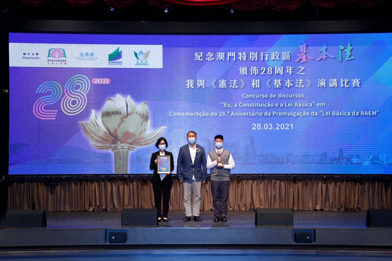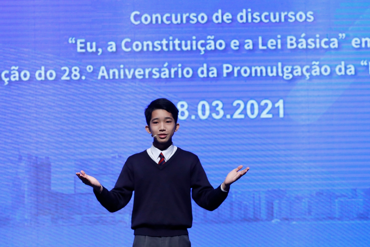 为持续向青少年推广《宪法》和《基本法》,澳门基本法推广协会、法务局、教育及青年发展局和市政署联合主办的“纪念《澳门特别行政区基本法》颁布28周年之我与《宪法》和《基本法》演讲比赛”决赛已于3月28日在圣保禄学校礼堂顺利举行。