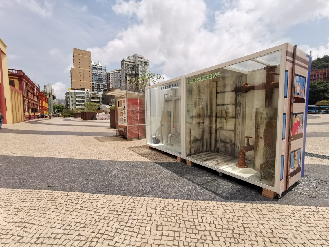 展出的邋遢水箱和洁净水箱各高约两米,左右并列摆放,形成强烈对比。邋遢水箱展示了疏于清洗水箱以及维护自来水系统可能引致的恶劣情况,当中包括污垢积聚、细菌滋生、水管及排水阀门老化等,最终流入家居的食水很可能出现变黄、有异味、水压不稳等二次供水安全问题,影响住户健康。洁净水箱则呈现了妥善维护自来水系统,包括每半年清洗水箱之后的良好状态。另外,水箱内部陈列了清洗水箱的工具,背面则展览有关疏于维护楼宇自来水系统容易发生的问题、洗清水箱步骤以及“楼宇安心用水计划”的详细资料。
