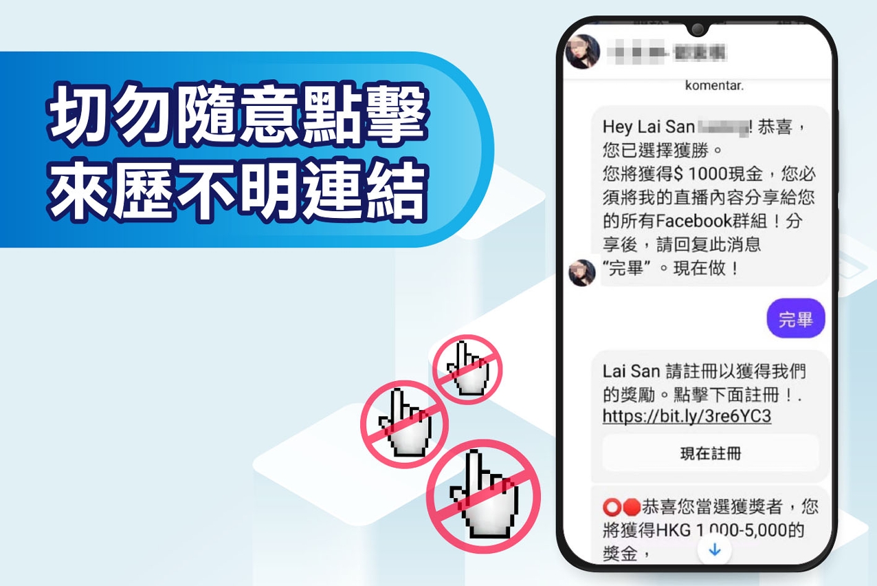 近日司警局接获市民举报,称于网络社交平台接到与香港某位女明星同名的帐号发送的信息,内容指事主当选获奖者,只要事主在网络社交平台朋友群组内分享该位“女明星”的直播内容,并点击该条信息内附有的链接及注册,便可获得1,000至5,000港元现金。该名市民怀疑有人藉此骗取个人资料,故没有上当,并马上向司警局作出举报。