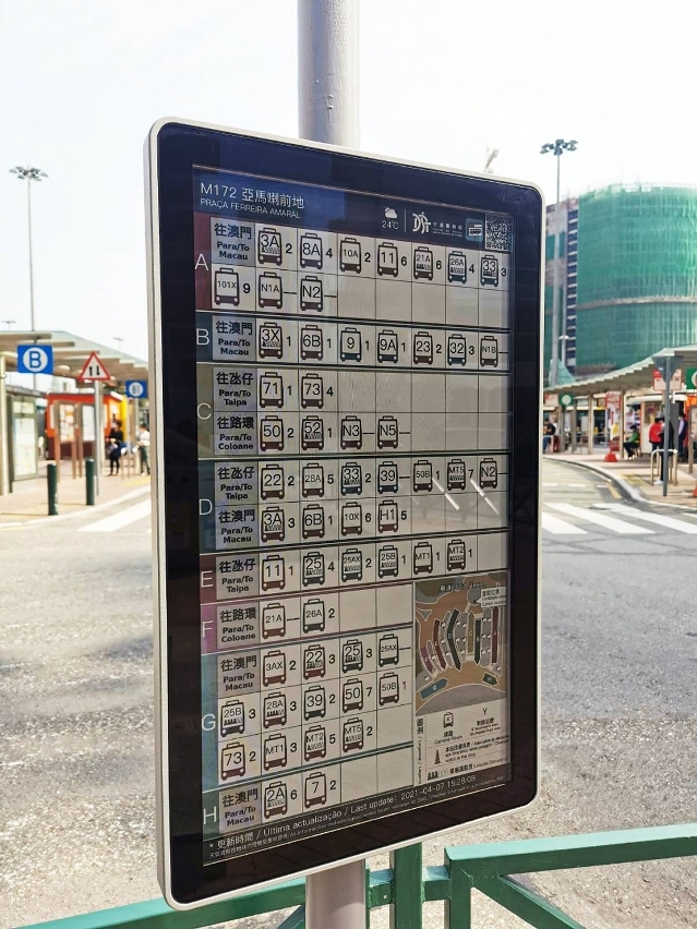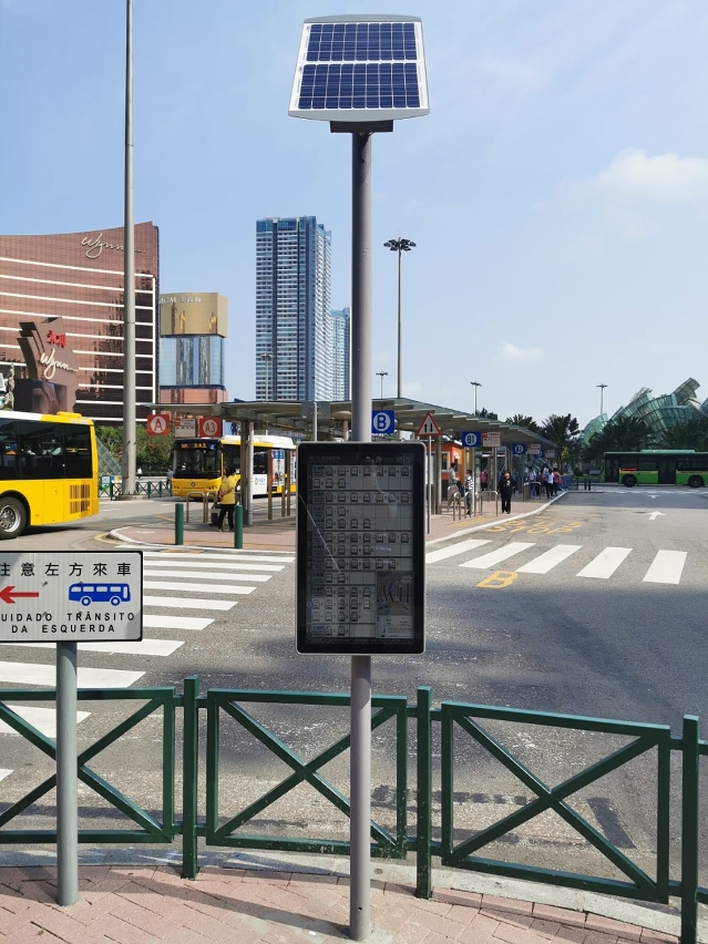 32吋太阳能彩屏电子站牌的安装工作已有序开展,继“亚马喇前地”站后,局方将陆续于“和谐广场/乐群楼”站、“约翰四世大马路”站、“高美士/马六甲街停车场”站、“华宝花园”站、“氹仔电讯”站进行安装。