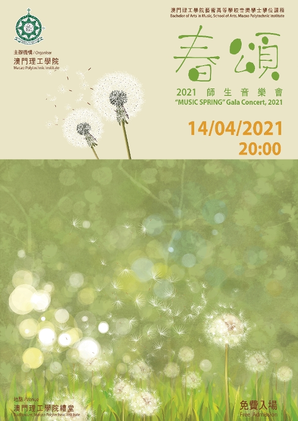 为向社会展示教学成果,分享音乐正能量,澳门理工学院将于4月14日晚上八时正,在该院礼堂举行《春颂》师生音乐会,由音乐学士学位课程师生联袂演出,以乐会友,呈献歌颂春天、绽放青春的美妙乐章。