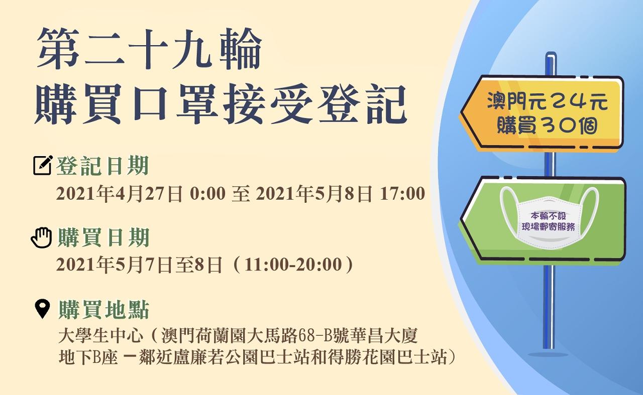 新一轮“保障口罩供应澳门居民计划”将于4月27日开始,凡正于外地高校升学、进行交流或实习项目、正修读因升读高教课程而开设的预备课程或语言课程的澳门学生,可于澳门时间2021年4月27日至5月8日下午5时期间登入教育及青年发展局网页(https://aeees.dsedj.gov.mo/mk/)先登记及预约时间,再由受托人协助购买口罩(澳门元24元30个)。