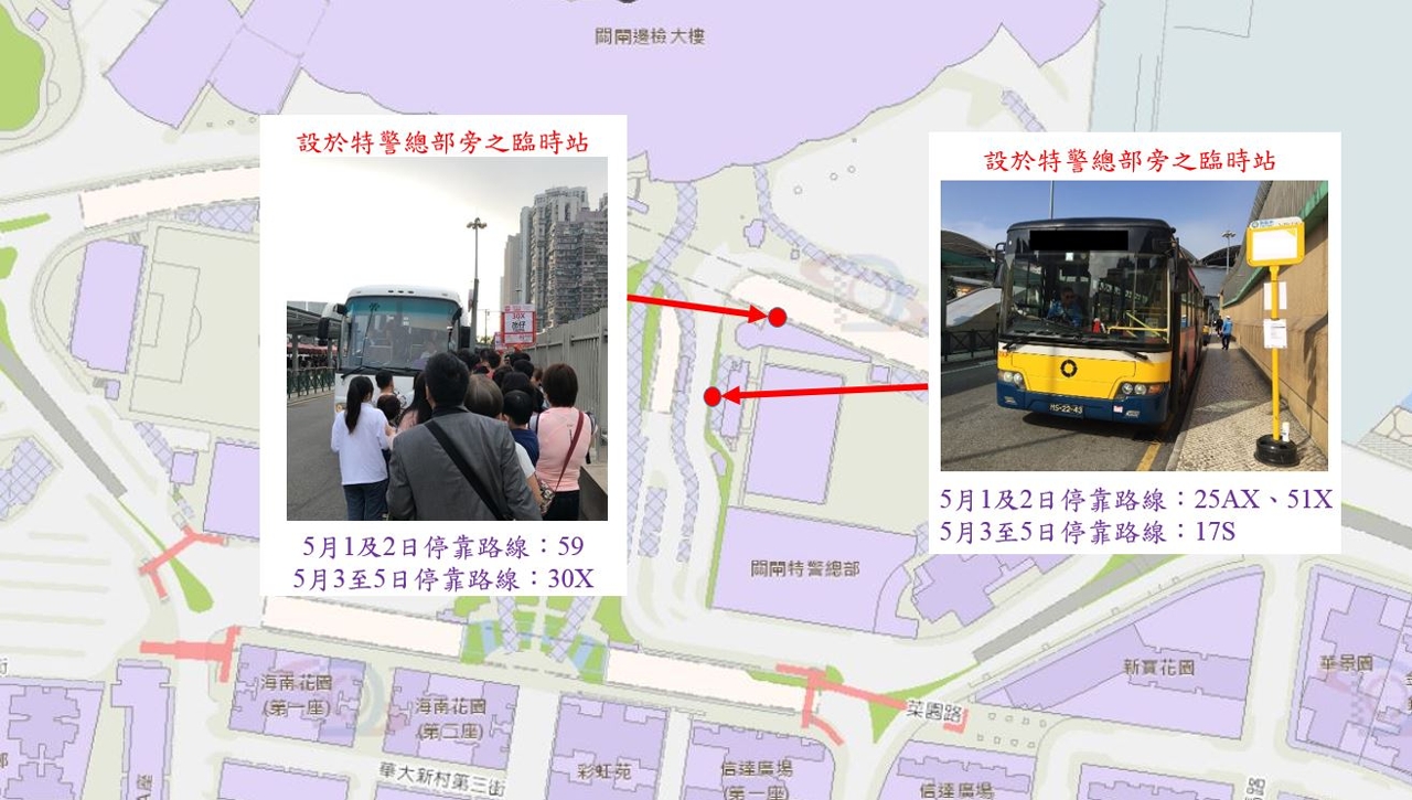 将维持停靠“关闸广场”站 (关闸广场东侧),但会视乎实际客流情况,改停靠特警总部旁临时站。 |