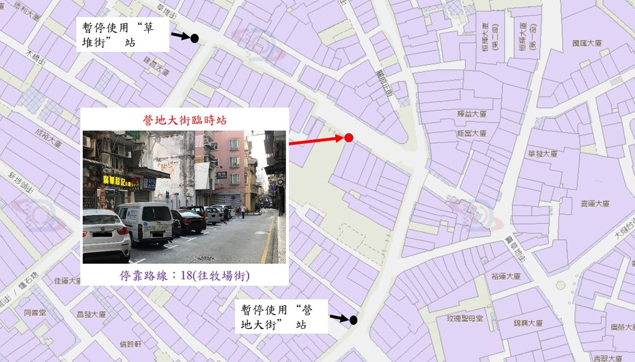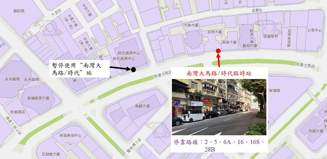 5月1日(周六)上午9时至5日(周三)晚上8时,介乎殷皇子大马路与苏亚利斯博士大马路之间一段罗保博士街临时改为无出口道路,以设置乘客排队设施。另外,南湾大马路近商业银行之的士上落客区会视乎实际人流情况暂停使用。