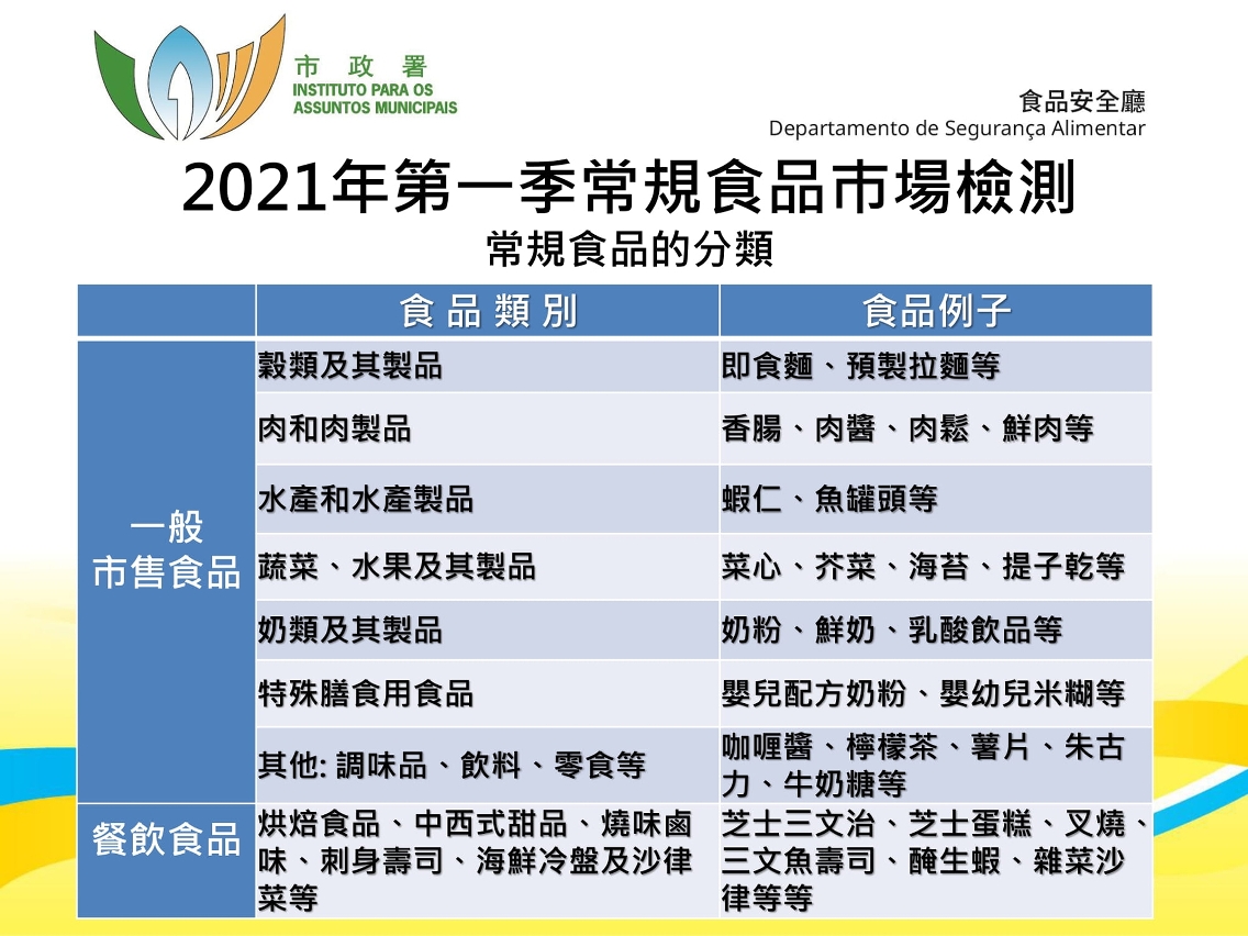 第一季抽检的四百五十九个食品样本中,包括一百九十一个一般市售食品样本及二百六十八个餐饮食品样本,抽检点涵盖本澳各区食肆、外卖店、超级市场、杂货店及百货公司等。所有食品样本于化学、微生物学及辐射水平检验中均未见异常。微生物学检测项目包括沙门氏菌属等常见的致病菌,化学检测项目则包括重金属、食品添加剂及农药残留等,而辐射检测项目则包括铯和碘等放射性物质。