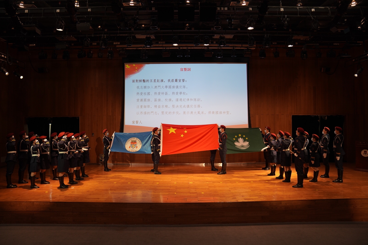澳门大学国旗仪仗队举行换届仪式。仪式上进行了任命和交接仪式,并对过去一年表现优异的仪仗队队员进行了表彰。