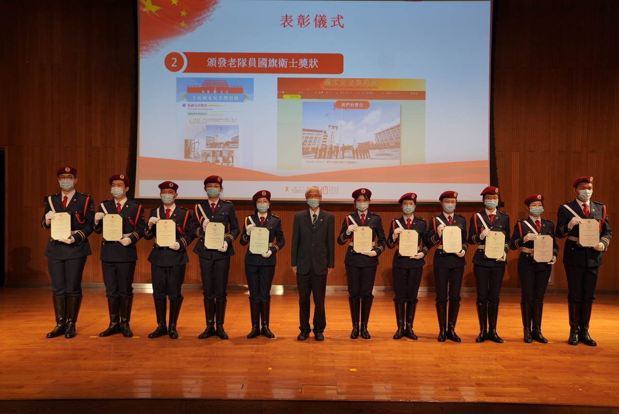 澳大学生事务长彭执中向表现优异的新队员及贡献卓越的第一、二届队员分别颁发训练标兵和国旗卫士奬状。“2019/2020学年国旗仪仗队最佳积极支持书院奖”由吕志和书院获得,其院长叶铭泉和学生资源处处长张学森向第一届退役队员颁发证书,感谢他们的贡献。毕业的退役队员、第二任副队长陈思翰代表发言。