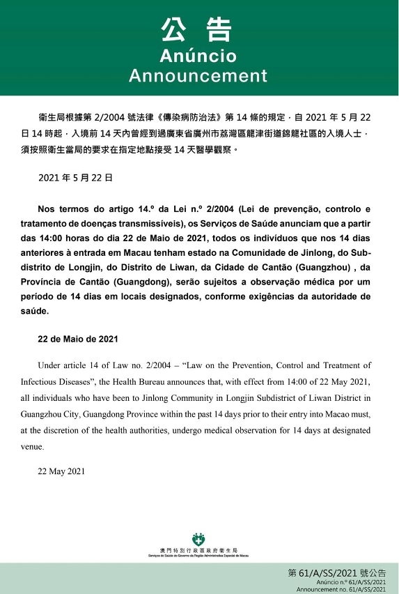 新型冠状病毒感染应变协调中心宣布,因应广东省的疫情变化,卫生局根据第2/2004 号法律《传染病防治法》第14 条的规定,自 2021年5月22日下午2 时起,所有在入境前14天内曾经到过广州市荔湾区龙津街道锦龙社区的入境人士,须按照卫生当局的要求在指定地点接受14 天医学观察,违反者除可能依法承担相应的刑事责任外,尚可被采取强制隔离的措施。