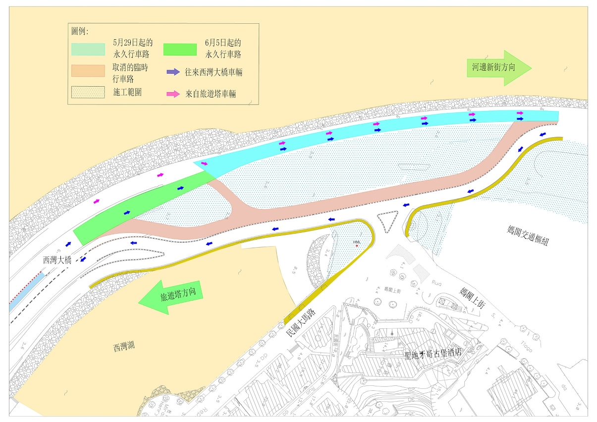 1. 因进行西湾大桥封桥设施安装及周边管道安装工程,沿旅游塔一侧道路前往河边新街的车辆自5月29日将恢复使用靠近海边位置的西湾湖景大马路通行(详见图一);此外,由氹仔从西湾大桥往澳门妈阁的车辆自6月5日起可直接进入靠近海边的西湾湖景大马路通行(详见图二)。