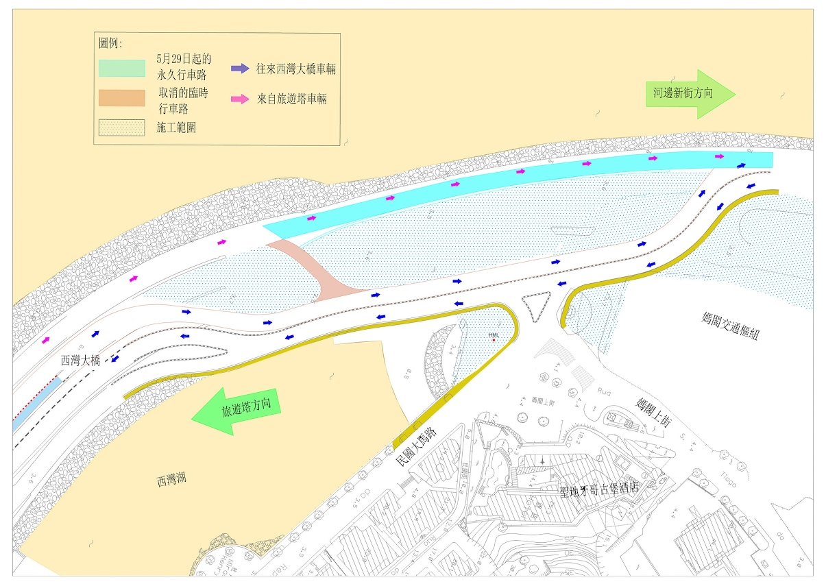 2.沿西湾湖景大马路往旅游塔及西湾大桥往氹仔的行车方向则维持现时的行车路线。