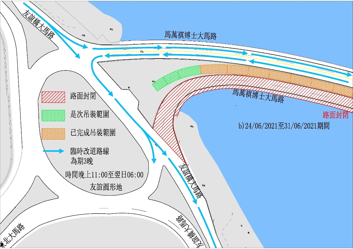 为配合友谊圆形地行车天桥钢结构箱型梁的装嵌工序,于6月1日起至7月15日期间,由晚上11时至翌日清晨6时友谊圆形地一带需作有限度通车,请驾驶者留意现场交通指示。