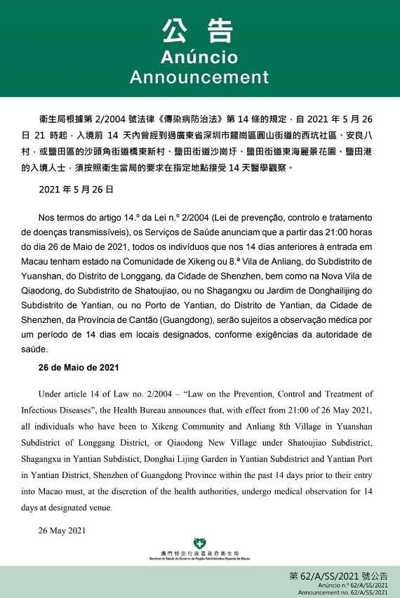 新型冠状病毒感染应变协调中心宣布,因应深圳市的疫情变化,卫生局根据第2/2004 号法律《传染病防治法》第14 条的规定,自 2021年5月26日21时起,所有在入境前14天内曾经到过深圳市龙岗区园山街道的西坑社区、安良八村,或盐田区的沙头角街道桥东新村、盐田街道沙岗圩、盐田街道东海丽景花园、盐田港的入境人士,须按照卫生当局的要求在指定地点接受14 天医学观察,违反者除可能依法承担相应的刑事责任外,尚可被采取强制隔离的措施。