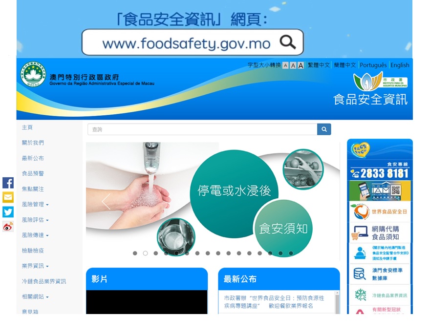 此外,市政署于食品安全信息网 www.foodsafety.gov.mo 及食品安全信息手机应用程序增设“停电或水浸后食安须知”专页,并上载防灾善后食水及食品安全手册及指南,以及一系列教育视频短片,透过多元途径教导食品业界及市民尽力完善自主食安卫生管理,欢迎业界及市民查阅。