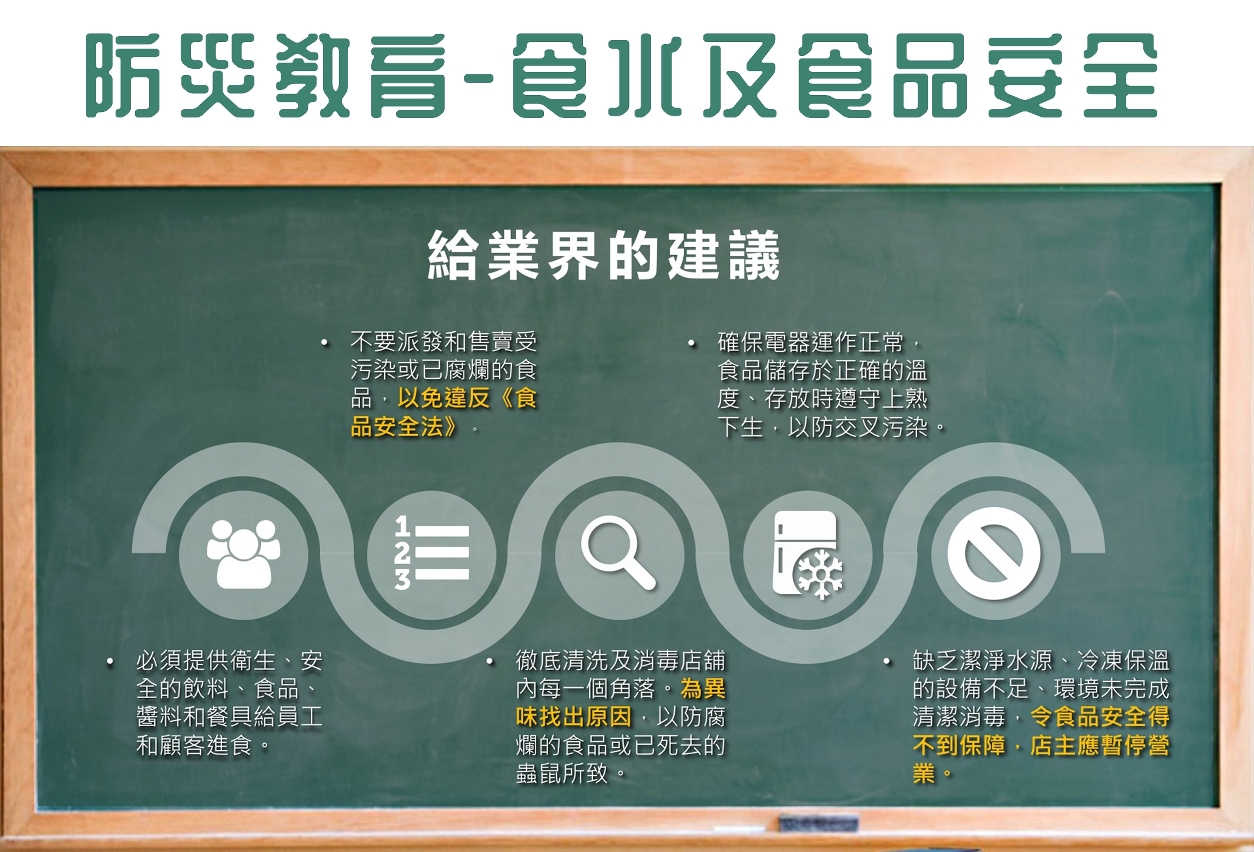 市政署亦分别于面向业界和市民设的培训课程中,加设风季食安防护内容,讲解防灾善后食水及食品安全的相关信息,藉此提升公众的防灾避险和公共卫生意识,避免因停电或水浸等原因而危害食品的安全性。