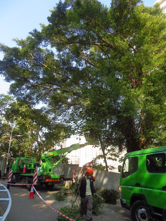 为更好地安排风季前的树木修剪工作,市政署与交通事务局及治安警察局密切沟通,协调路况以方便人员修剪树木,有序安排风季前优先疏剪主干道路树的树冠及护理结构差、长势弱的树木。至五月,市政署人员已检查行道树及绿化带约14,000株、公园及公园内路旁斜坡约11,000株树木,修剪超过5,000多株行道树,移除100多株于城巿及路边有安全隐患的树木;于公园有39株树木因枯萎或感染褐根病而须移除,176株因结构存在危险缺陷及对公众构成风险而须要修剪,亦完成超过300株树木风季前预防折枝或倒塌的修剪工作。另外,为倾斜角度大而有倒塌风险的树木建造、调整及更换大型金属支撑架,涉及10株于公园的大树及10株古树。