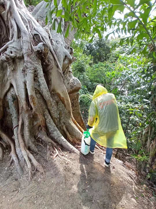 位于路环竹湾马路的假菩提古树,于二零一九年十月,经广州市林业和园林科学研究院古树专家评估为木质部裸露及已感染根腐病,当采用TRU树木雷达根系检测,结果也显示该树之东南侧地下极少深根分布,故为古树加设支撑架,并进行持续监察。今年四月,树木管护人员发现古树生长势突然下降,树冠叶片数量及面积较正常稀少,叶色较淡,健康明显不良。虽然近期已进行施药抢救,惟其中一主干已明显枯萎,考虑到枯枝位于人流位置及接近行车道,故计划于本月中下旬作出修剪,降低意外风险。