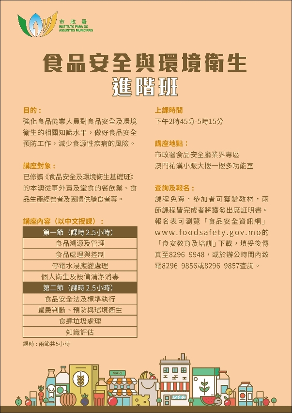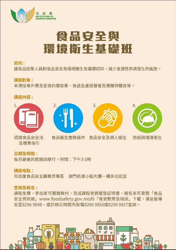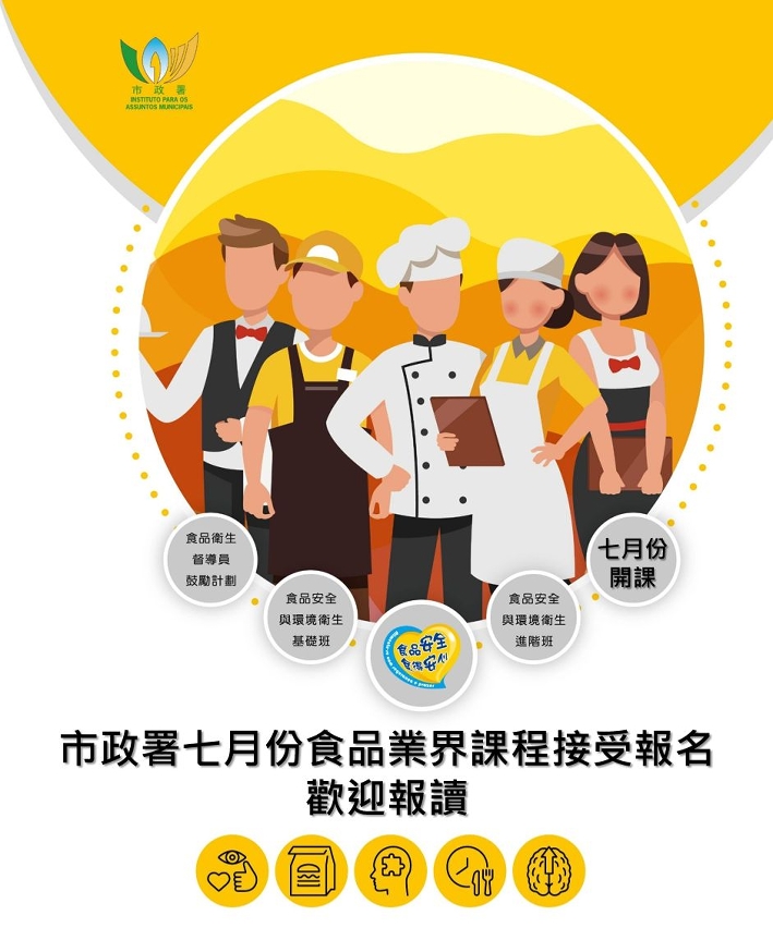 市政署恒常于每月最后一个星期四开办食品安全与环境卫生基础班,7月份课程将于29日于佑汉小贩大楼1楼食品业界专区举行,课时约2小时,完成课程者可获发证明书。课程主要讲授堂食及外卖食安注意事项,特别是在食品采购、贮存、处理、个人卫生及日常操作中容易忽略的食安要点,并讲解《食品安全法》及食安标准等相关内容,以及预防和控制鼠患的有效方法等,非常适合有意开设或从事餐饮行业人士参与,截止报名日期为7月21日。