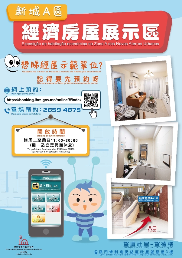 配合经屋的申请,设于望厦社屋-望德楼的新城A区经济房屋展示区明(13)日起开放参观,今(12)日起接受市民预约参观时间。展示区设有《经济房屋法》及新城A区城市规划的介绍,并透过三个户型的示范单位,展示新城A区经屋单位的间隔及用料等。