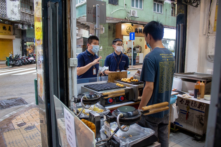 热带风暴 “查帕卡”吹袭本澳,三号风球悬挂。澳门生产力暨科技转移中心人员往访位处低洼地区的中小企商户,呼吁他们做好抗洪防灾措施,同时并发出手机短讯予已申请安装防洪门及升降台的商户,提醒他们做好防水浸措施,保护财物免受影响