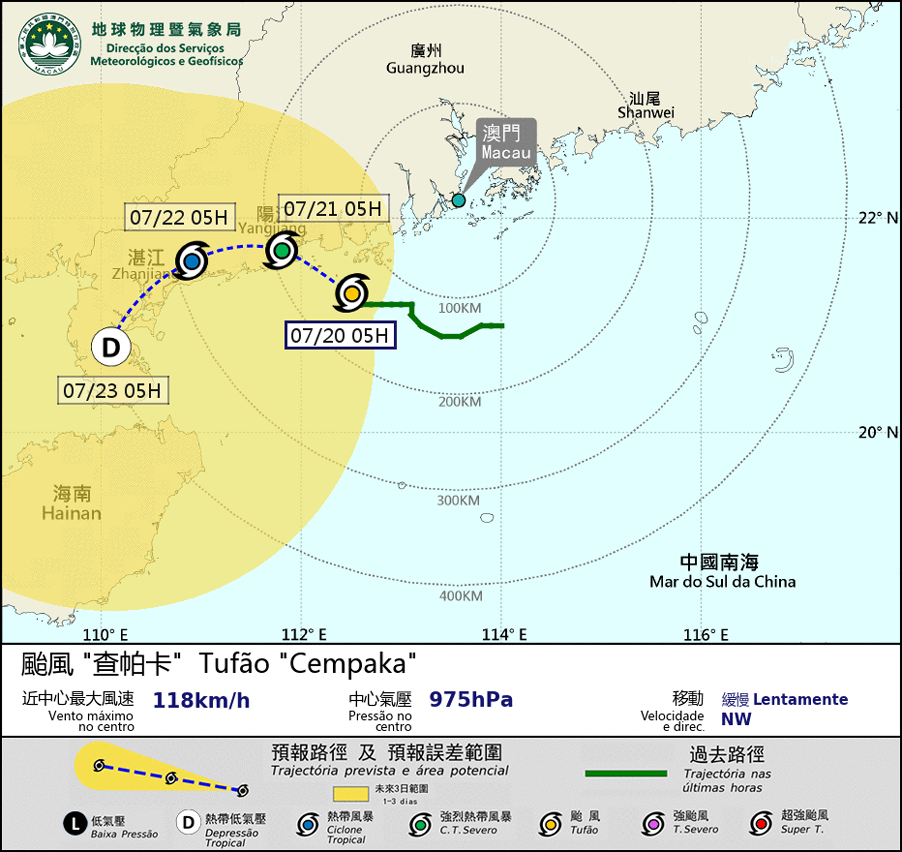 台风「查帕卡」于19日晚间虽然显着增强,但其暴风圈只保持较小的范围,并采取较预期偏西的方向移动,与本澳保持超过140公里以上距离,较预期远,因此预料早上风力进一步增强的可能性较低,三号风球将于在早上维持。预料「查帕卡」日间逐渐接近阳江沿岸,除非「查帕卡」再次转向采取接近澳门的路径移动,否则需要改发更高风球的机会不大。由于「查帕卡」的强度和路径仍存在不确定性,市民继续保持警觉及留意最新风暴消息。
