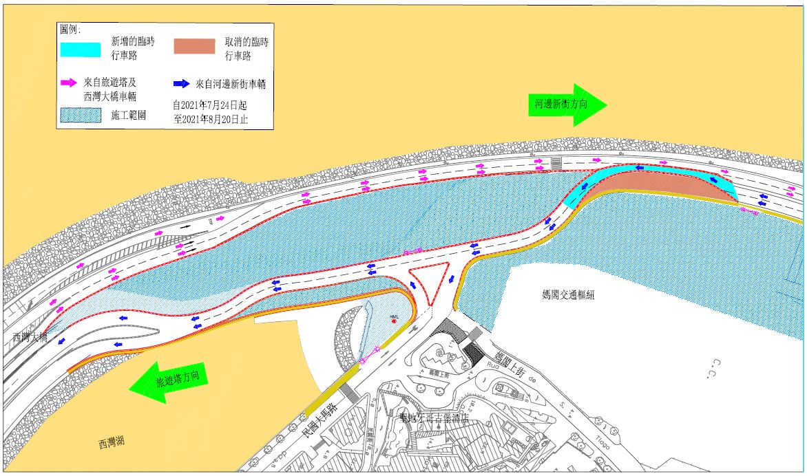 为配合渠道接驳工作,由7月24日(星期六)至8月20日(星期五)西湾湖景大马路近轻轨妈阁站一段道路,两侧双向行车道将实施有限度通车(详见附图),敬希驾驶者留意及遵守现场交通警员的指挥及安排。