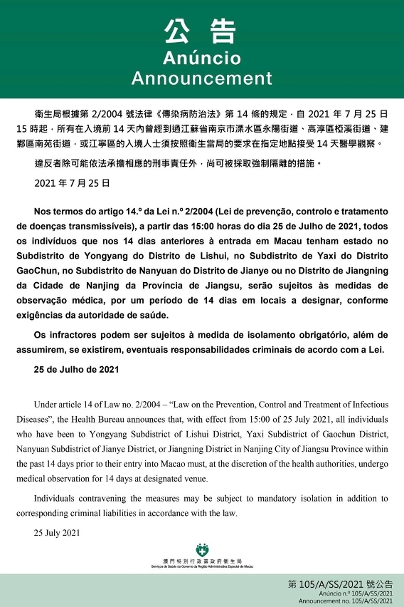 新型冠状病毒感染应变协调中心宣布,因应江苏省南京市的疫情变化,卫生局根据第2/2004号法律《传染病防治法》第14条的规定,自2021年7月25日下午3时起,所有在入境前14天内曾经到过江苏省南京市溧水区永阳街道、高淳区桠溪街道、建邺区南苑街道,或江宁区的入境人士须按照卫生当局的要求在指定地点接受14天医学观察的措施。违反者除可能依法承担相应的刑事责任外,尚可被采取强制隔离的措施。