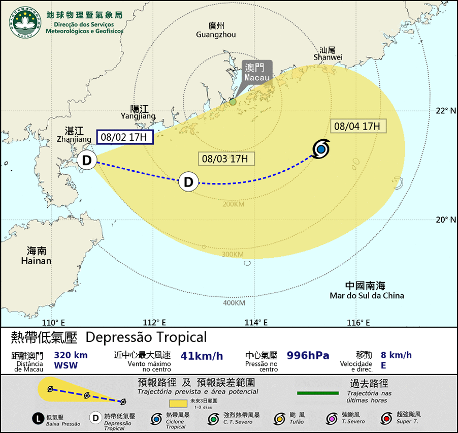 热带低气压目前正集结在广东西部沿岸,未来两三日将会有所增强并向东移动横过南海北部,为广东沿岸带来不稳定天气,本澳间中会有大骤雨及雷暴,风力将有所增强及有阵风。预料热带低气压3日晚间至4日清晨最接近本澳,但其路径仍存在不确定性,请市民密切留意天气变化并关注最新风暴消息。