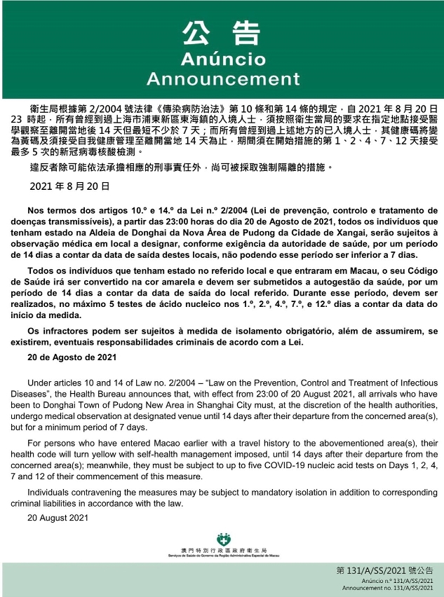 新型冠状病毒感染应变协调中心宣布,因应上海市的疫情变化,卫生局根据第2/2004号法律《传染病防治法》第10条和第14条的规定,自2021年8月20日晚上11时起,所有曾经到过上海市浦东新区东海镇的入境人士,须按照卫生当局的要求在指定地点接受医学观察至离开当地后14天但最短不少于7天;而所有曾经到过上述地方的已入境人士,其健康码将变为黄码及须接受自我健康管理至离开当地 14 天为止,期间须在开始措施的第 1、2、4、7、12 天接受最多 5 次的新冠病毒核酸检测。免费核酸检测预约连结为https://app.ssm.gov.mo/mandatoryrnatestbook。核酸检测结果不会上载至澳门健康码亦不可作为出入境用途。如需将核酸检测结果在澳门健康码显示,则须自费检测。