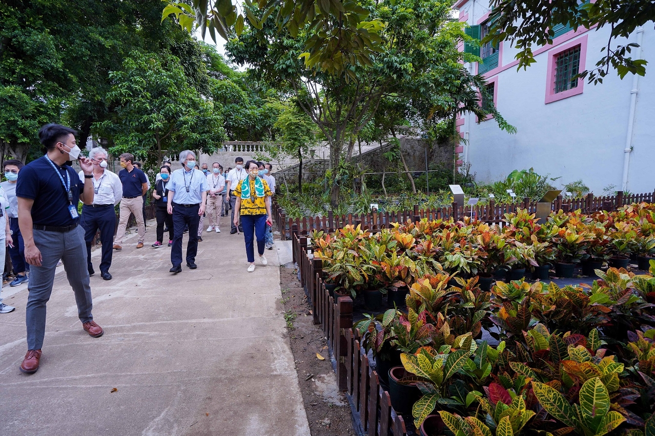 另外,咨询委员亦到了过去只供内部使用,现经整理后对外开放的白鸽巢苗圃参观,苗圃面积约四千五百平方米,分为上下两层,上层分五个区域,包括观花植物区、香花植物区、观叶植物区、耐荫植物区以及观赏盆景区,约有八十种植物,共四千八百盆;市民除观赏外,亦可使用手提电话扫瞄介绍牌上的二维码,获取介绍各种植物特性的资料。而为了保留当年白鸽巢苗圃曾引入栽种及收集保留外地植物的历史意义,市民可于苗圃区内观赏其中二十五种历年来本澳从外地引种之树种。