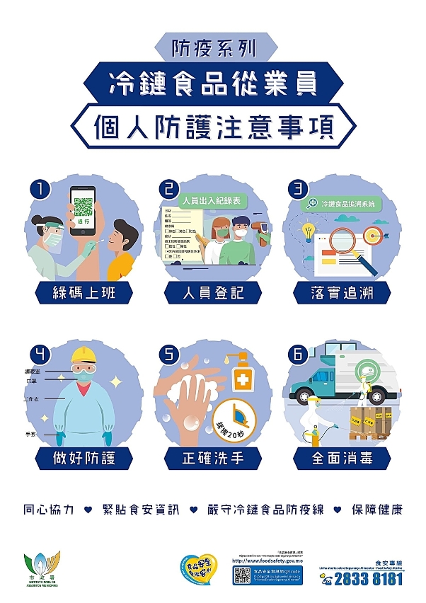市政署于食品安全资讯网www.foodsafety.gov.mo设有“有关新型冠状病毒的饮食安全注意事项”、“冷链食品业界资讯”专页,以图文并茂方式提供一系列指引及教育短片等宣教内容,让市民及业界掌握准确资讯,在有序地恢复日常生活的同时,能科学且理性地助力防疫抗疫常态化发展。