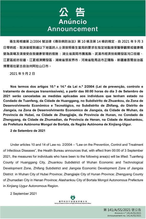 新型冠状病毒感染应变协调中心宣布,因应湖北省、湖南省、河南省和新疆维吾尔自治区的疫情变化,卫生局根据第2/2004号法律《传染病防治法》第10条和第14条的规定,自2021年9月3日零时起,取消曾经到过以下地区的人士须按照卫生当局的要求在指定地点接受医学观察或健康码变为黄码及须接受自我健康管理的措施:湖北省黄冈市团风县,武汉市经济技术开发区沌口街道、江夏区纸坊街道、江夏经济开发区;湖南省张家界市 ;河南省驻马店市正阳县;新疆维吾尔自治区博尔塔拉蒙古自治州阿拉山口市。