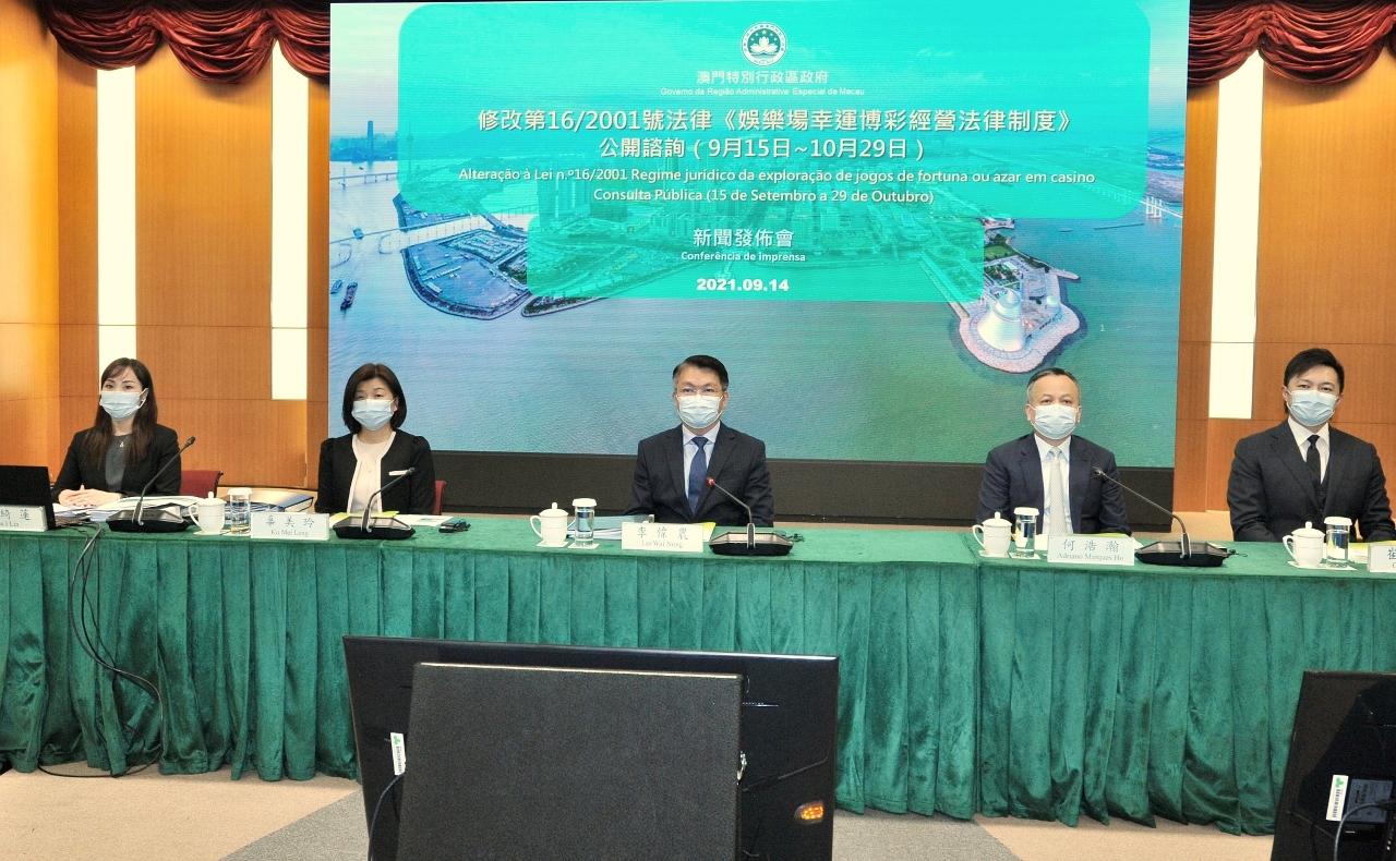 特区政府今(14)日举行新闻发布会,公布就修改第16/2001号法律《娱乐场幸运博彩经营法律制度》由9月15日开始,展开为期45天的公开咨询,咨询期内将举办5场咨询会听取公众的意见。