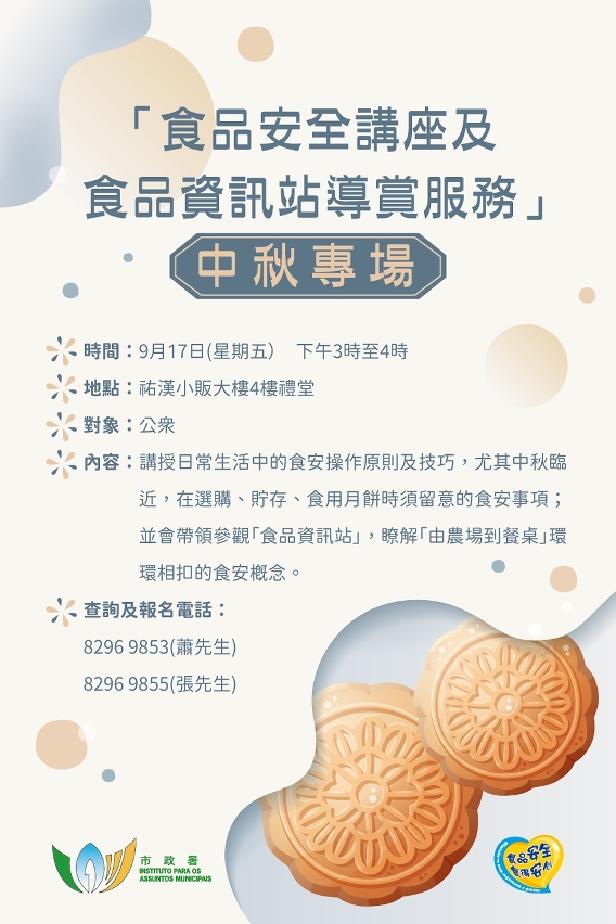 市政署持续向社会大众提供各类食安培训讲座,因应中秋佳节临近,将于九月十七日举办「食品安全讲座及食品资讯站导赏—中秋专场活动」,向市民讲授时令的食安注意事项,提升社会大众的食安防范意识,欢迎市民及团体报名参加。