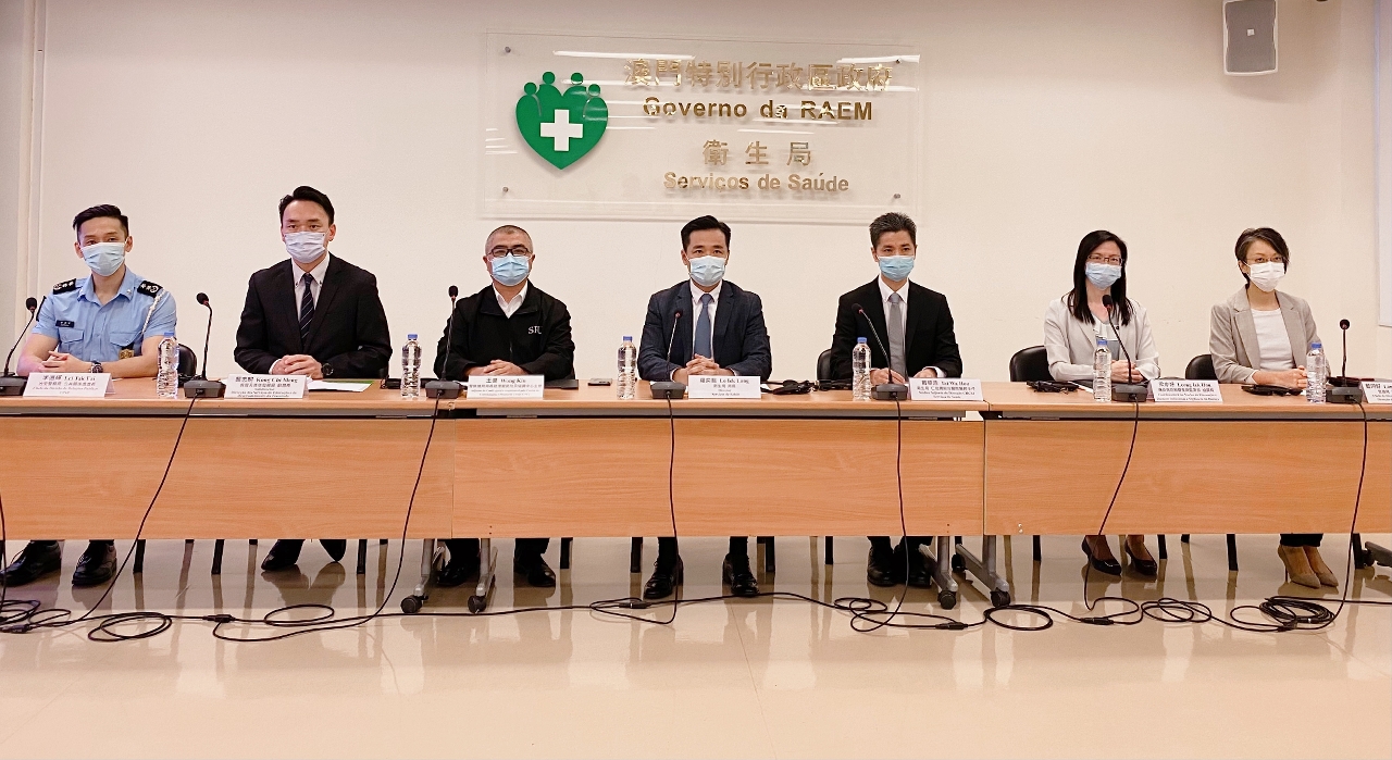 新型冠状病毒感染应变协调中心(下称应变协调中心)于今(26)日举行记者会,卫生局罗奕龙局长、警察总局局长助理暨民防及协调中心王健主管、教育及青年发展局龚志明副局长、仁伯爵综合医院戴华浩医务主任、治安警察局公共关系处李德辉处长、旅游局公共关系处蓝同好处长、疾病预防控制中心传染病防制暨疾病监测部梁亦好协调员共同会见传媒。
