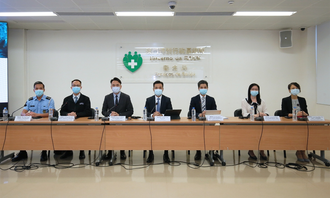 新型冠状病毒感染应变协调中心(下称应变协调中心)于今(4)日举行记者会,卫生局罗奕龙局长、教育及青年发展局龚志明副局长、仁伯爵综合医院戴华浩医务主任、警察总局警务联络及公共关系处张健欣处长、旅游局公共关系处蓝同好处长、治安警察局行动及通讯处马超雄处长、疾病预防控制中心传染病防制暨疾病监测部梁亦好协调员共同会见传媒。