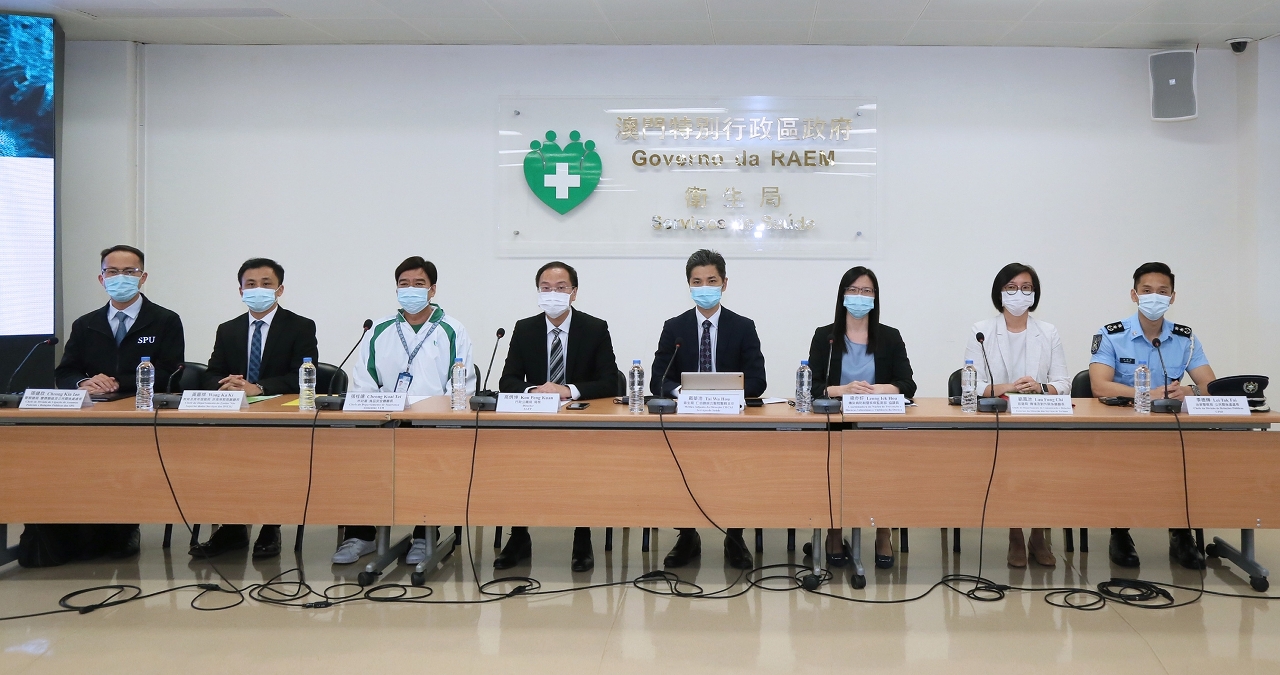 新型冠状病毒感染应变协调中心(下称应变协调中心)于今(5)日举行记者会,行政暨公职局高炳坤局长、仁伯爵综合医院戴华浩医务主任、市政署食品安全厅张桂达厅长、教育及青年发展局非高等教育厅黄嘉祺厅长、旅游局传播及对外关系厅刘凤池厅长、警察总局警务联络及公共关系处张健欣处长、治安警察局公共关系处李德辉处长和疾病预防控制中心传染病防制暨疾病监测部梁亦好协调员共同会见传媒。