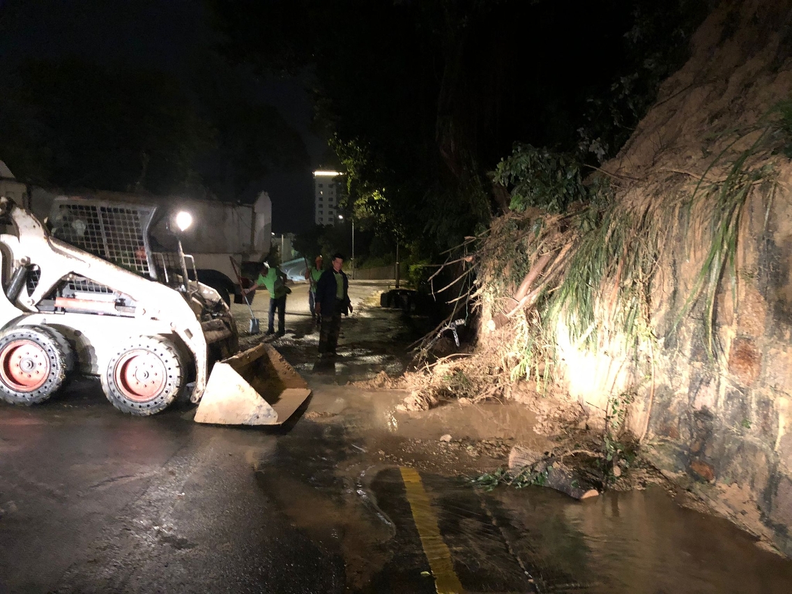 热带风暴「狮子山」影响本澳期间,气象局先后发出黄色及红色暴雨警告,当中红色暴雨警告,持续时间逾七小时。暴雨持续冲刷山体,让路环多处地点发生山泥倾泻,有部分范围甚至占据整条行车路面。市政署随即派员进行清理工作,除以人手外亦出动重型机械对大面积的山泥进行清理,经人员连夜工作,目前除路环乡村马路仍维持封闭外、黑沙马路、竹湾马路及鸡颈马路等多段马路经已基本开通或有限道通车,相关路边近斜坡位置亦已围封并加闪灯,提醒驾驶者留意。
