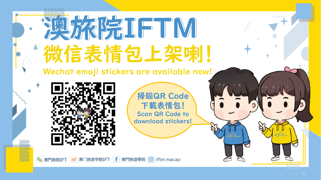 澳门旅游学院正能量微信表情包由即日起可于微信贴图市集搜索“澳旅院”下载或附图二维码( https://w.url.cn/s/ABZgvKL#wechat_redirect ),欢迎各界使用,齐来了解澳门旅游学院以学生为本的教学理念和精彩多元的校园文化。