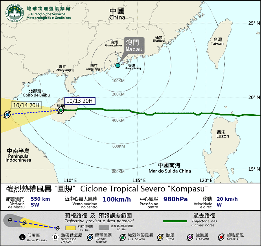 「圆规」正横过海南岛并将进入北部湾。本澳受「圆规」相关环流影响,晚间及14日初时仍会有骤雨及雷暴,间中会有6至7级强风及有阵风。