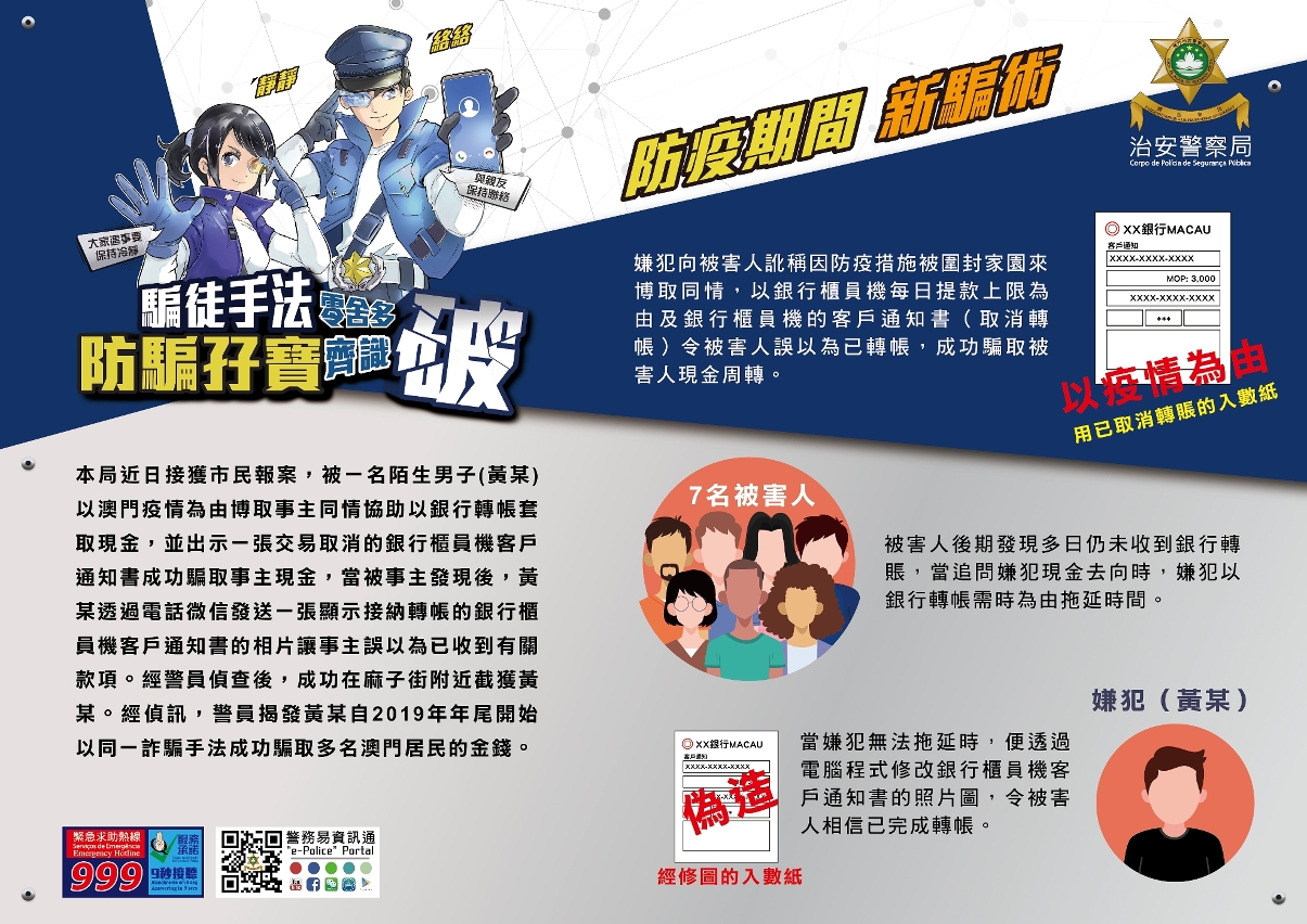 治安警察局于10月7日侦破一宗连环诈骗案件,案发于本年9月28日,一名本澳男子向一名女子声称其急需用钱,但因其提款卡在当天已超过了提款限额,而且其住所因疫情关系被围封,属黄码区不能进入,故无法返回家中提取现金,男子声称会先透过银行户口将4,000澳门元转帐给女子,希望女子给其4,000澳门元现金以解燃眉之急,其后女子答允协助男子,便将银行卡帐户编号给其。男子先到银行使用提款机转帐功能,并按下取消转帐交易,从而获得一张取消转帐交易的客户通知书,并利用「取消」转帐的客户通知书瞒骗女子信以为已成功转帐,便向男子交付4,000澳门元,但翌日女子到银行翻查帐户交易记录时,发现有关款项转帐失败便联络男子,男子便以银行转帐需时为由拖延时间,直至10月7日女子仍未收到有关款项,怀疑被骗,故报警求助。