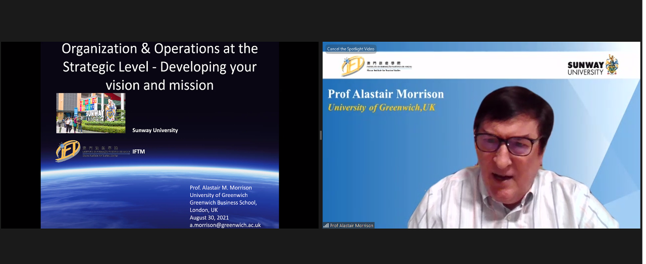 澳门旅游学院世界旅游教育及培训中心于2021年8月30日、9月1日、6日和8日为马来西亚双威大学本科毕业学生提供了为期4天的「战略管理」培训课程。超过70名学员参加了培训。这是澳门旅游学院世界旅游教育及培训中心与双威大学的首次合作与交流活动。该计划包括 8 场线上研讨会,主题涉及战略层面的危机管理、组织和运营、人力资源管理和领导力及战略变革。